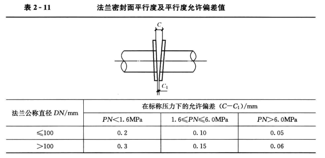 3、法蘭與法蘭對接連接時,密封面應(yīng)保持平行。法蘭密封面的平行度及平行度允許偏差值見表2-11。
