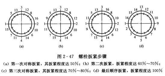 6、為保障墊片各處受力均勻,擰緊螺栓時應(yīng)對稱成十字交叉進行,如圖2-47所示。擰緊后螺栓露出螺紋的長度不應(yīng)大于螺栓直徑的一半,也不應(yīng)小于2mm。