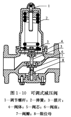 目前,高層建筑的生活和消防給水大多采用上行下給式供水,并且分不同的區域供水。但即使同一區域,因樓層高度相差太大,同一根立管上方和下方就會有不同的靜壓差,為了確保處于下方的閥件不致因壓力過高而損壞,必須在主管的某一個適當位置安裝減壓閥。減壓閥分為比例式和可調式兩大類。比例式減壓閥也稱定比式減壓閥,其閥前、閥后壓力成定比,閥后壓力不可調。定比式減壓閥應采用垂直安裝,注意不要堵塞排氣孔。圖1-10為可調式減壓閥示意圖。