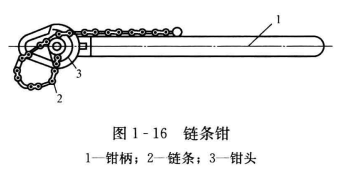 鏈條鉗的各部分均為優(yōu)質(zhì)碳素鋼制成,鋼鏈經(jīng)熱處理和拉力試驗(yàn)。鏈條鉗的外形如圖1-16所示。其規(guī)格以長(zhǎng)度劃分,見(jiàn)表1-11。
