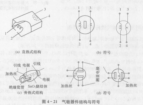 加熱方式一般有直熱式和旁熱式兩種,因而形成了直熱式和旁熱式氣敏元件。直熱式將加熱絲直接埋入SnO2、ZnO粉末中燒結(jié)而成,因此,直熱式常用于燒結(jié)型氣敏結(jié)構(gòu),其結(jié)構(gòu)和符號(hào)如圖4 - 21(a) (b)所示。旁熱式是將加熱絲和敏感元件同置于一個(gè)陶瓷管內(nèi),管外配以梳狀金電極做測(cè)量極,在金電極外再涂上SnO2等材料,其結(jié)構(gòu)和符號(hào)如圖4- 21(c) (d) 所示。