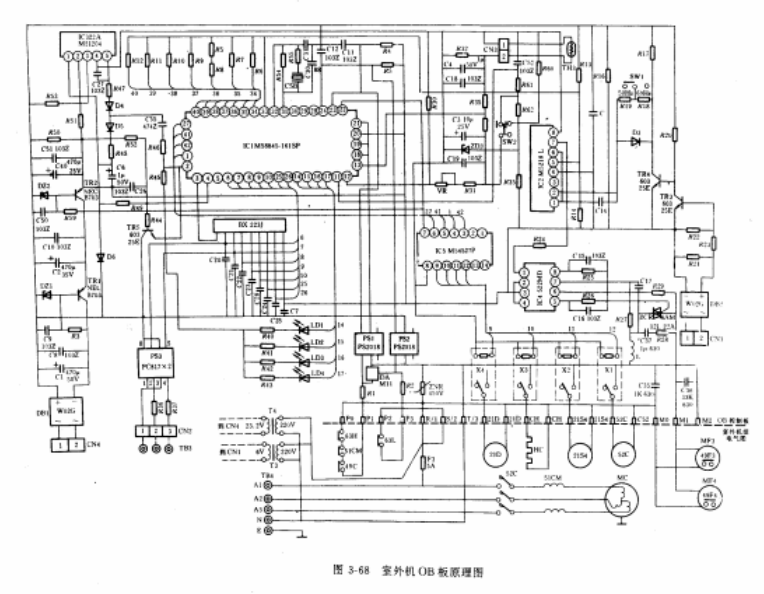 圖3-68是室外機(jī)OB板的原理圖。380V電源從TB4送入,經(jīng)保險(xiǎn)絲F3和N端向變壓器T3和T4輸入交流220V。T3次級(jí)輸出交流6V,從接插件CN1到DB2(W02G)整流后,輸出取樣信號(hào)送給TR3、TR4管放大。變壓器T4次級(jí)輸出交流23.2V,從接插件CN4到DB1C(W02G整流、C1濾波后,送給電源調(diào)整管TR1、DZ1和TR2、DZ2等元件組成的直流穩(wěn)壓電路,向OB板提供穩(wěn)壓電源。室內(nèi)機(jī)送來(lái)的制冷控制信號(hào)由CN2的1、2端輸入到光電耦合器PS3的1、2腳(PS3內(nèi)部由兩組PC817光電耦合器組成)再?gòu)钠?、8腳輸出信號(hào)到單片機(jī)IC1(M58845-161SP)的2和6腳,則IC1發(fā)出操作指令,IC1的(42)腳輸出高電平到功率驅(qū)動(dòng)芯片IC5(M54527P)的3腳,其對(duì)應(yīng)輸出端(12)腳呈低電平,繼電器X1吸合,X1的常開觸點(diǎn)閉合,接通接觸器52C的工作電源,52C觸點(diǎn)閉合,壓縮機(jī)MC啟動(dòng),進(jìn)行制冷。同時(shí),IC1的控制指令通過(guò)溫控電路送到IC4(522MD),再IC4由等元件組成的觸發(fā)電路,控制雙向可控硅BCR導(dǎo)通,而使室外風(fēng)機(jī)運(yùn)轉(zhuǎn)。用于測(cè)量冷凝器溫度的熱敏電阻TH3由CN3接入,變化信號(hào)通過(guò)與標(biāo)準(zhǔn)源電路比較后饋送至IC1,并通過(guò)IC2(M5218L)向IC4輸出信號(hào),控制雙向可控硅BCR的觸發(fā)信號(hào),自動(dòng)調(diào)整室外風(fēng)機(jī)MF3和MF4的運(yùn)轉(zhuǎn)速度。當(dāng)CN2的1、2間控制信號(hào)為0V時(shí),IC1的(42)腳由高電平變?yōu)榈碗娖?繼電器X1釋放,壓縮機(jī)停止運(yùn)轉(zhuǎn),但風(fēng)機(jī)照常排風(fēng),直到TH3的冷凝溫度到達(dá)下限值時(shí),觸發(fā)信號(hào)截止,可控硅即關(guān)閉風(fēng)扇MF3、MF4 電源。溫度上升后,又根據(jù)室內(nèi)機(jī)送入的控制信號(hào)重復(fù)上述制冷程序。
