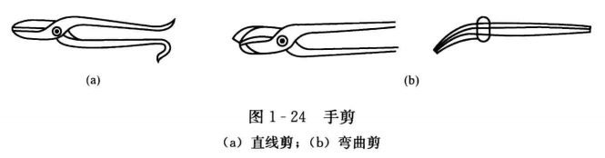 手剪主要用于剪切薄鋼板(或薄鐵皮)、橡膠墊、石棉橡膠板等。分直線剪和彎曲剪兩種,外形如圖1-24所示。直線剪用于剪切直線和曲線的外圓,彎曲剪用于剪切曲線的內(nèi)圓。手剪剪切鋼板的厚度小于或等于1. 2mm,適用于剪切剪縫不長(zhǎng)的工件,不可剪切比刃口還硬的金屬和用錘子錘擊剪刀背。當(dāng)剪板材中間孔時(shí),應(yīng)該先用鏨子開(kāi)一個(gè)孔,然后將剪刀尖插入孔內(nèi)進(jìn)行剪切。
