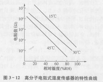 特性:高分子電阻式濕度傳感器的優(yōu)點是測量濕度范圍大,工作溫度在0~50℃,響應(yīng)時間小于30s,其感濕特性曲線如圖3-12所示。