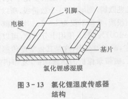 結構:氧化鋰濕敏電阻是利用吸濕性鹽類潮解,離子導電率發生變化而制成的測濕元件。由氧化鋰感濕膜電極,基片和引腳組成,其結構如圖3-13所示。