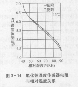 特性:氯化鋰濕度傳感器測量范圍為(10~95)%RH,在(50~80)%RH相對濕度范圍內,電阻和濕度呈線性變化關系,工作溫度為-10~50℃,響應時間小于60s。氯化鋰濕度傳感器的濕度-電阻特性曲線如圖3-14所示。氯化鋰濕敏元件的優點是滯后小,不受測試環境的影響,測量精度達(±2~5)%RH,但其耐熱性能差,不能用于露點溫度以下測量,其重復性不理想。