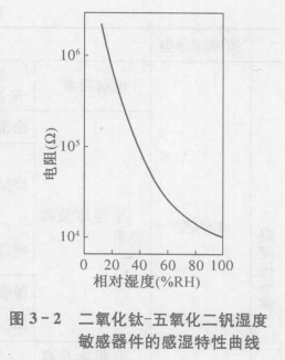 濕度傳感器都有其自身的感濕特征量,例如電阻、電容、擊穿電壓、溝道電阻等。濕度敏感器件的感濕特征隨環境相對濕度(或絕對濕度)變化的曲線,稱為器件的感濕特征量一一環境濕度特征曲線(簡稱感濕特性曲線)。圖3-2是二氧化鈦-五氧化二釩濕度敏感器件的感濕特性曲線。