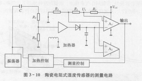 圖3-10為測量電路的原理圖,其中RT為補償熱敏電阻,RH為檢測用濕敏傳感器。為了使檢測濕度的靈敏度最大,應使RT = RH,此時信號電壓經跟隨器、整流、濾波,再與比較器A1的參考電壓U1進行比較后輸出控制信號,以便控制某一濕度。