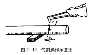 氣割操作時,首先在管子上畫出切斷線,并將管子墊平、放穩,同時在管子下面留出一定的空間。起割時,要先預熱割件邊緣,火焰呈亮紅色時,再逐漸打開切割氧氣閥,同時沿著管子的切斷線均勻、緩慢地向前推進切割,如圖2-12所示。