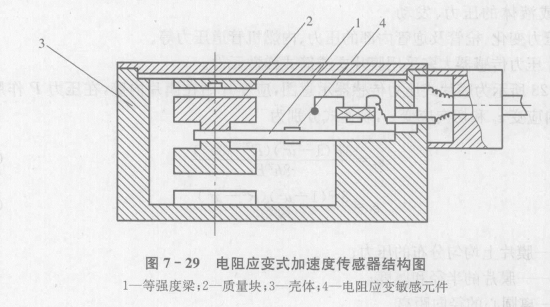 應變式加速度傳感器的結構如圖7-29所示,在等強度梁的自由端安裝質量塊;梁的另一端固定在殼體上。等強度梁上粘貼4個電阻應變敏感元件。為了調節振動系統阻尼系數,在殼體內充滿硅油。