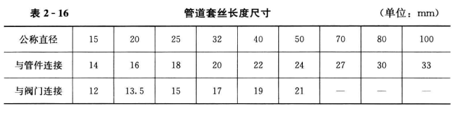 套絲頭時對套絲的管口應(yīng)加機(jī)油。管道套絲應(yīng)按管徑尺寸分次套制絲扣,一般當(dāng)管徑為15~32mm時應(yīng)套2次,40~50mm時套3次,70mm以上套3-4次,管道套絲長度見表2-16。