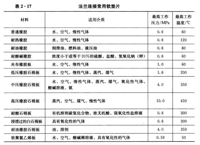 管道用法蘭盤及襯墊必須滿足管道設(shè)計工作壓力的要求,見表2-17。采暖和熱水供應(yīng)管道的法蘭襯墊宜采用橡膠石棉墊;給排水管道的法蘭襯墊宜采用橡膠墊。