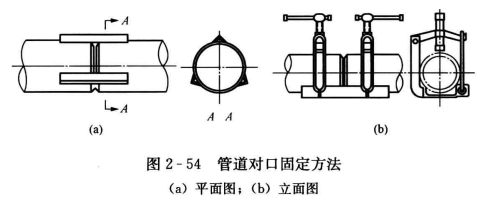 (4)管道接口處的斷面應與管的中心線垂直。其垂直度可用樣板檢查。焊接前應認真對正,保證兩根管子的軸線重合,組對時,要用定心夾持器固定進行點焊,然后再正式焊接,如圖2-54所示為常用的固定方式。