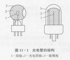 光電管的結構如圖11 - 1所示。它是在一個抽成真空的玻璃泡內裝有兩個電極即陽極和光電陰極(簡稱陰極)組成。當陰極受到適當波長的光線照射時便發(fā)射光電子,光電子被帶正電位的陽極所吸引,這樣在光電管內就有電子流,在外電路中便產生了電子流,輸出電壓。光電流的大小與照射在光電陰極上的光強度成正比,并與光電陰極的材料有關。當光通量一定時,真空光電管陽極電壓與陽極電流的伏安特性曲線見圖11 - 2。