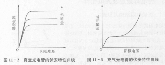 光電管除真空光電管外,還有充氣光電管。這兩種光電管的結構基本相同,所不同的只是在充氣光電管玻璃泡內充有少量的惰性氣體,如氨或氛。當光電極被光照射而發(fā)射電子時,光電子在趨向陽極的途中撞擊惰性氣體的原子,使其電離,從而使陽極電流急速增加,提高了光電管的靈敏度,但其穩(wěn)定性、頻率特性等都比真空光電管的差。圖11 - 3給出了充氣光電管的伏安特性曲線。