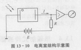 利用電離室測量核輻射強度的示意圖見圖13 - 10。在電離室兩側的互相絕緣的電極上,施加極化電壓,使兩極板間形成電場,在射線作用下,兩極板間的氣體被電離,形成正離子和電子,帶電粒子在電場作用下運動形成電流,于是在外接電阻上便形成壓降。電流與氣體電離程度成正比,電離程度又正比于射線輻射強度,因此,測量電阻 R上的電壓值就可得到核輻射強度。