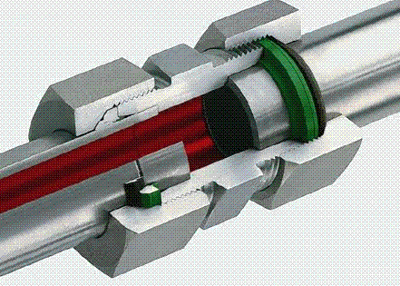 預裝檢查完畢后,進行卡套式連接正式裝配,即將已預裝了螺帽和卡套的鋼管插入接頭體,用扳手擰緊螺帽,直至擰緊力矩突然上升(即達到力矩激增點),再將螺帽擰緊1/4圈(不要多擰),裝配完成。