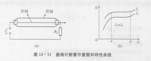 蓋格計數管的特性曲線如圖13 - 11(b)所示。J1、J2代表人射的核輻射強度,且J1>J2。由圖可知,在外電壓U相同的情況下,入射的核輻射強度越強,蓋格計數管內產生的脈沖N 越多。蓋格計數管常用于探測α射線和β粒子的輻射量 (強度)。
