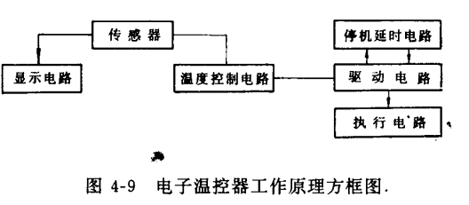 電冰箱電子溫控器的工作原理:是由傳感器、冷藏室溫度控制電路、停機延時電路、驅動電路、執行電路、顯示電路組成,方框圖見圖4-9所示。