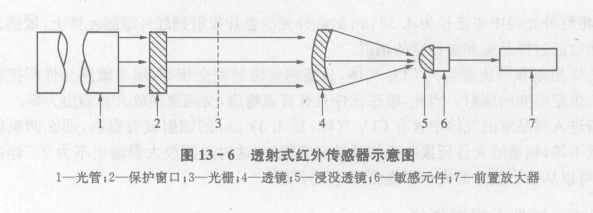 透射式光學系統(tǒng)的紅外探測器如圖13-6所示。透射式光學系統(tǒng)的部件用紅外光學材料制成,不同的紅外光波長應選用不同的紅外光學材料:在測量700℃以上的高溫時,用波長為0.75~3km范圍內(nèi)的近紅外光,用一般光學玻璃和石英等材料做透鏡材料;當測量100~700℃范圍的溫度時,一般用3~5μm的中紅外光,多用氟化鎂.氧化鎂等熱敏材料;測量100℃以下的溫度用波長為5~14μm的中遠紅外光,多采用鉗、硅、硫化鋅等熱敏材料。獲取透射紅外光的光學材料一般比較困難,反射式光學系統(tǒng)可避免這一困難,所以,反射光學系統(tǒng)用得較多。