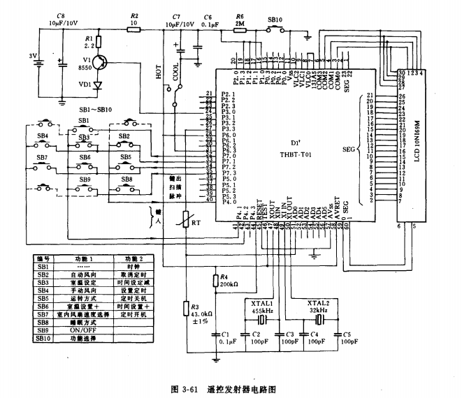 遙控器發射器的具體電路如圖3-61所示。由圖可知,發射器主要由大規模集成電路芯片DI(THBT-T01)、455kHz晶體振蕩器、32kHz晶體振蕩器、LCD液晶顯示屏、室溫傳感熱敏電阻Rt、LED紅外線發射二極管,激勵三極管V1、鍵盤矩陣電路等元件組成。該發射器由5號電池供電,電壓為3V。