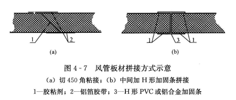 7、風(fēng)管長邊尺寸小于或等于1600mm時,風(fēng)管板材拼接可切45°角直接粘接,粘接后在接縫處兩側(cè)粘貼鋁箱膠帶;風(fēng)管長邊尺寸大于1600mm時,板材需采用H形PVC或鋁合金加固條拼接(圖4-7)。