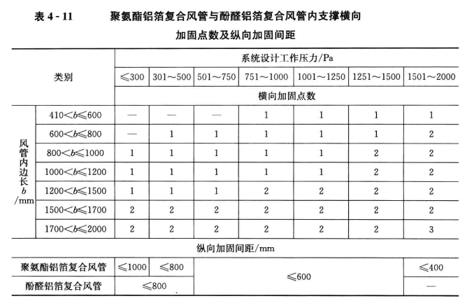 1、風管宜采用直徑不小于8mm的鍍鋅螺桿做內支撐加固,內支撐件穿管壁處應密封處理。內支撐的橫向加固點數和縱向加固間距應符合表4-11的規定。