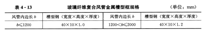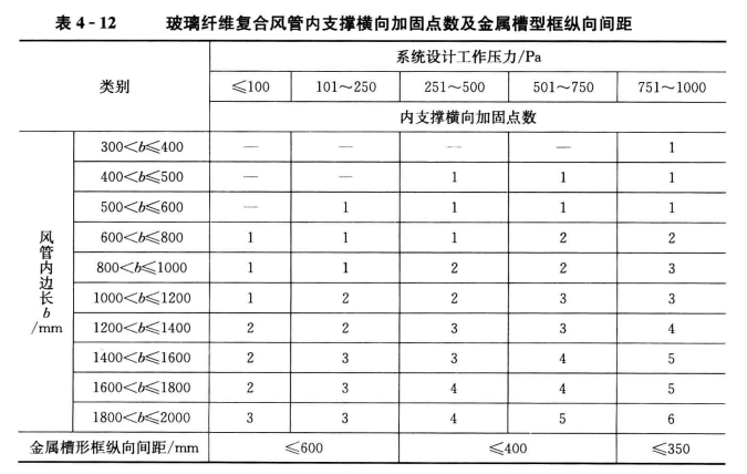 2、風管的內支撐橫向加固點數及金屬槽型框縱向間距應符合表4-12的規定,金屬槽型框的規格應符合表4-13規定。