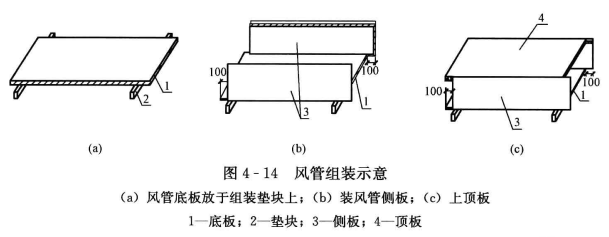 3)組裝風(fēng)管時,先將風(fēng)管底板放于組裝墊塊上,然后在風(fēng)管左右側(cè)板階梯處涂膠粘劑,插在底板邊沿,對口縱向粘接應(yīng)與底板錯位100mm,最后將頂板蓋上,同樣應(yīng)與左右側(cè)板錯位100mm,形成風(fēng)管端口錯位接口形式(圖4-14)。