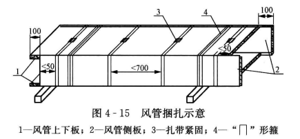 4、風(fēng)管組裝完成后,應(yīng)在組合好的風(fēng)管兩端扣上角鋼制成的“∏”形箍," ∏”形箍的內(nèi)邊尺寸應(yīng)比風(fēng)管長邊尺寸大3~5mm,高度應(yīng)與風(fēng)管短邊尺寸相同。然后用捆扎帶對風(fēng)管進(jìn)行捆扎,捆扎間距不應(yīng)大于700mm,捆扎帶離風(fēng)管兩端短板的距離應(yīng)小于50mm(圖4-15)。