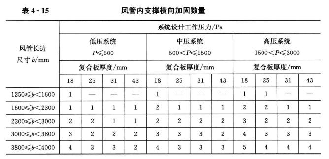2、風管內(nèi)支撐橫向加固數(shù)量應符合表4-15的規(guī)定,風管加固的縱向間距應小于或等于1300mm。