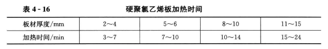 1、硬聚氯乙烯板加熱可采用電加熱、蒸汽加熱或熱空氣加熱等方法。硬聚氯乙烯板加熱時間應符合表4-16的規定。