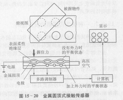 例如, 裝有觸覺傳感器的機(jī)械手, 能感受是否抓住零件,并能自動(dòng)將零件置于手的中心。圖15 - 20為金屬圓頂或高密度接觸式傳感器。外界的壓力使彈件金屬圓頂彎曲,從而接觸到下面的觸點(diǎn)。該種類型的觸覺傳感器靈敏度可通過金屬圓項(xiàng)和接觸點(diǎn)之間的空氣壓力進(jìn)行調(diào)整。接點(diǎn)信息可通過多路調(diào)制器選擇后送和入計(jì)算機(jī)進(jìn)行處理。