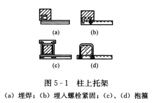 通風(fēng)管道在柱上敷設(shè)時(shí),可以將托架焊在預(yù)埋鐵件上或緊固到預(yù)埋的螺栓上。若沒(méi)有預(yù)埋鐵件和螺栓,可以用圓鋼與角鋼做成抱箍,把托架夾在柱子上,柱上安裝的托架形式如圖5-1所示。