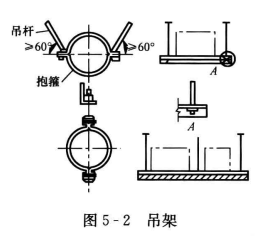 當(dāng)風(fēng)管敷設(shè)于樓板或者析架下面離墻較遠(yuǎn)時(shí),通常采用吊架來(lái)安裝風(fēng)管。矩形風(fēng)管的吊架,由吊桿與橫擔(dān)組成;圓形風(fēng)管的吊架,由吊桿與抱箍組成,其吊架形式如圖5-2所示。