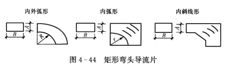 當矩形彎頭寬度超過500mm時,在彎頭直角處應(yīng)當設(shè)置導(dǎo)流葉片,導(dǎo)流葉片位置和外形尺寸應(yīng)當符合設(shè)計要求,如圖4-44所示。