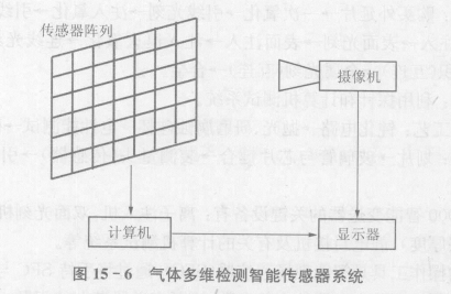 15-6為氣體多維檢測智能傳感器系統。圖中的傳感器陣列為由64個半導體氣體傳感器組成的二維面陣。氣體傳感器陣列的輸出經過信號調整電路進入數字計算機,經過計算機的分析處理,將氣體的空間信息送到顯示器上進行顯示,這樣就可以用肉眼觀察到氣體的空間和時間的實時分布信息。比如觀察酒精的揮發過程,我們可以在顯示器上觀察到酒精揮發的整個過程圖像。由于計算機進行信號分析處理的速度是非??斓?所以在顯示器上顯示的氣體圖像信息是實時的,非常直觀。
