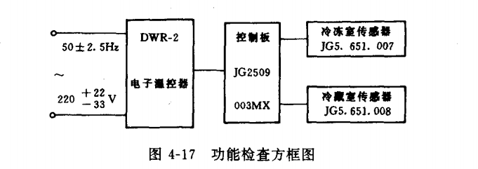 對電子溫控器進行功能檢查方框圖如圖4-17.將控制板和傳感器連接好(即對接相應插頭座S2和XP2,XS3和XP3),然后再和DWK-2電子溫控器連好,連接關系如圖中所示。用(50士2.5)Hz,單相(220十22)V的交流電源供電。一33V。