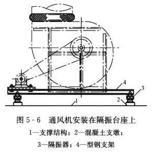 通風(fēng)機(jī)在運(yùn)轉(zhuǎn)過(guò)程中,由于葉片離心力的作用,會(huì)引起振動(dòng)且產(chǎn)生噪聲。這些振動(dòng)與噪聲通常會(huì)對(duì)精密設(shè)備、建筑結(jié)構(gòu)以及人體產(chǎn)生不良影響。因此,一般將通風(fēng)機(jī)安裝在減振臺(tái)座上,在臺(tái)座與樓板或者基礎(chǔ)之間放置減振器或減振襯墊,如圖5-6所示。