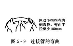 3、連接管應當盡量減少彎曲,必須彎曲時,應當按預定管路走向來彎曲連接管,并且將管端對準室內外機組的接頭。彎曲時不得折斷或者弄彎管道,管道彎曲半徑應當盡量要大一些,其彎曲半徑不得小于100mm。其管道的彎曲方法,如圖5-9所示。
