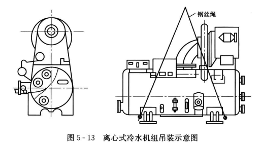 2、拆箱后應(yīng)當(dāng)連同原有的底排子,拖到安裝地點(diǎn),吊裝鋼絲繩要設(shè)在蒸發(fā)器與冷凝器筒體支座外側(cè),并且注意不要使鋼絲繩在儀表板、油水管路上受力,鋼絲繩與設(shè)備接觸點(diǎn)應(yīng)當(dāng)墊以軟木板。如圖5-13所示。
