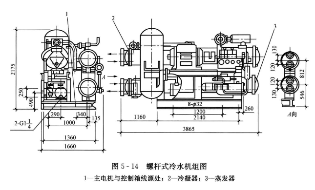 1、螺桿式冷水機(jī)組的安裝,如圖5-14所示。基礎(chǔ)要求與就位、找正找平的方法,與活塞式冷水機(jī)組相同。機(jī)組的縱、橫向水平度偏差應(yīng)小于0. 1 %。