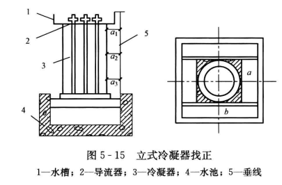 2、立式冷凝器找正方法,如圖5-15所示。測(cè)量上、中、下三點(diǎn),a、b位置各測(cè)一次,a1、a2、a3的值差不大于1/1000。