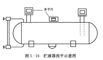2、設(shè)備吊裝就位后,應(yīng)當(dāng)找平找正,如圖5-16所示。在殼體上最少測(cè)量三點(diǎn),用以確定貯液桶的水平度。無(wú)集油器與集油器在中間的貯液桶,應(yīng)當(dāng)水平安裝,不水平度允許偏差為1/1000;集油器在一端的,應(yīng)以1/1000的坡度坡向集油器。