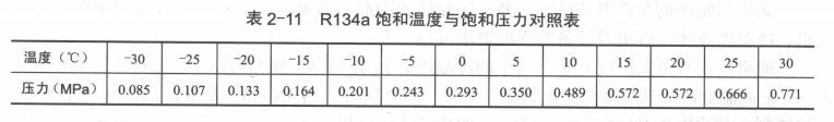 2)飽和壓力較高 與R12相比,同溫度下R134a的飽和壓力較高,使三星級冰箱在制冷工況下運行時低壓段出現負壓狀態,這就要求在維修過程中須確保注氟工具密封性良好,以防空所和水分進入系統。而高壓段由于溫度較高,壓力較大,則需要對壓縮機的結構材料作部分改動。在對冰箱修理時,應根據R134a飽和狀態熱力性質中溫度與壓力的對應關系值進行細致調試,以保證設備達到原工況要求。R134a飽和溫度與飽和壓力對應關系見表2-11所示。