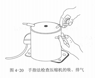 1)手指法 將壓縮機通電動轉,用大拇指按住高壓排氣口或低壓吸氣口,如圖4-20所示。如手指按不住排氣口,再用手指按住吸氣口,若感覺有較強的吸力,表示壓縮機正常,可以使用。若高壓排氣很小,甚至沒有,說明高壓汽缸蓋墊或汽缸體紙墊已擊穿,同時也有可能是高、低壓冰片已擊碎。若有排氣,但氣量不足,則說明壓縮機效率較差。若沒有排氣,但能聽到“嘶嘶”聲,停機后則消失,說明高壓緩沖S管與機殼連接處、出氣帽處斷裂或是出氣帽捍片沖破漏氣,需更換新壓縮機或送修理廠家開殼修理。