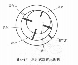 ②葉片旋轉(zhuǎn)式壓縮機(jī)的結(jié)構(gòu)    葉片旋轉(zhuǎn)式(滑片式)壓縮機(jī)的結(jié)構(gòu)如圖4-13所示。在圓柱形的汽缸里 , 裝一個(gè)繞固定軸旋轉(zhuǎn)的圓柱形轉(zhuǎn)子(活塞)。轉(zhuǎn)子上開(kāi)有數(shù)個(gè)徑向狹槽,槽里裝有能作徑向移動(dòng)的滑片。轉(zhuǎn)子軸線與汽缸軸線不重合,存在一個(gè)偏心距 ,轉(zhuǎn)子的一側(cè)總是與汽缸壁接觸 ,使汽缸內(nèi)壁與轉(zhuǎn)子外表面間構(gòu)成一個(gè)月牙形空間。轉(zhuǎn)子旋轉(zhuǎn)時(shí),滑片在離心力作用下其端部與汽缸壁緊貼 ,從而將月牙形空間分隔成若干個(gè)肩形基元容積。轉(zhuǎn)子旋轉(zhuǎn)一周,每個(gè)基元容積將經(jīng)歷最小-最大-最小的變化?;綁嚎s機(jī)正是通過(guò)每個(gè)基元容積的擴(kuò)大和縮小,來(lái)完成制冷劑燕氣的吸入、壓縮和排出的。