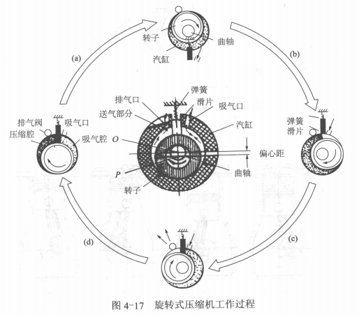 葉片固定式壓縮機工作過程如圖4-17所示, 轉(zhuǎn)子活塞沿汽缸內(nèi)壁滾動一周,完成吸氣、壓縮和排氣一個全過程。當活塞處于圖4-17 (a)位置時,汽缸內(nèi)成為一個完整的月牙型容積,其壓力為吸氣壓力, 這時處于吸氣結(jié)束,不壓縮也不排氣(排氣閥關(guān)閉 )的狀態(tài)。當活塞順時針滾動14周,如圖4-17 (b)所示時,滑塊把月牙形容積分割為吸氣腔和排氣腔兩部分,吸氣腔開始吸入氣體,排氣腔內(nèi)的氣體受壓縮而壓力逐漸升高。活塞繼續(xù)滾動,如圖4-17 (ec)所示位置時,吸氣腔不斷擴大而吸入氣體,排氣腔不斷縮小而氣體壓力逐漸升高,當壓力升高到稍大于排氣壓力,并足以克服閥片彈簧力時,項開閥片開始排氣,這時吸氣與排氣同時進行。當活塞滾動至圖4-17 (d)所示位置時,吸、排氣還在進行,但已接近結(jié)束,活塞繼續(xù)滾動回到圖4-17 (a)所示位置,吸、排氣結(jié)束,將進入下一周期的運行。可見,壓縮機吸氣幾乎是連續(xù)的,而排氣是間歇性的,因而不設(shè)吸氣閥、只設(shè)排氣閥。因此,吸氣節(jié)流損失小、容積效率高。