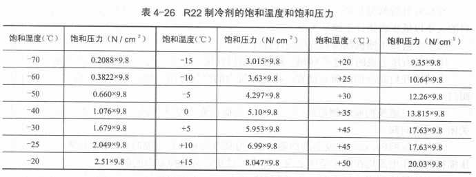 2)測壓力 制冷劑飽和蒸氣的溫度與壓力是一一對應(yīng)的關(guān)系。知道制冷劑的燕發(fā)溫度和冷凝溫度,即可確定對應(yīng)的飽和壓力。如氟利昂R22制冷劑的溫度與壓力之間的關(guān)系,見表 4-26。
