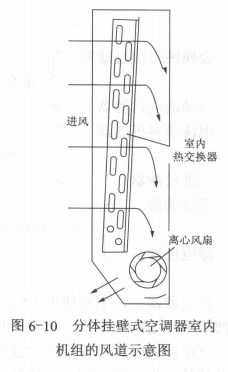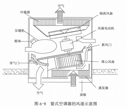 風道是空調通風系統不可缺少的組成,有合理風道才能有一定的出風量。一般說,通風系統的風道大致可分室內空氣循環風道和室外空氣冷卻風道。風道有塑料板、薄鋼板或沙包板制作構成。圖6-9為窗式空調器的風道示意圖。圖6-10為分體掛壁式空調器室內機組的風道示意圖。